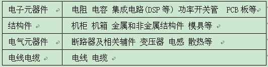 逆变器企业主要外购产品包括各种电子元器件、结构件、电气元器件、电线电缆等,光伏发电用逆变器主要原料参见下表:
