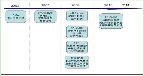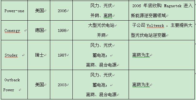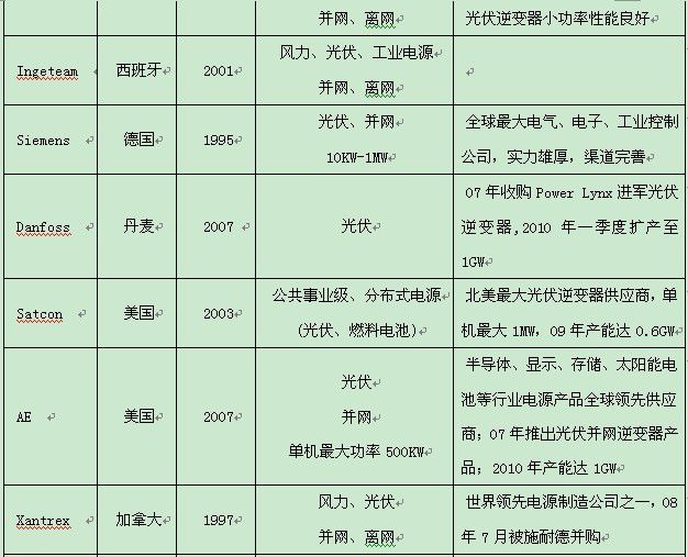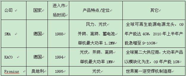 美国、日本工业基础雄厚,光伏逆变器生产商也具有很强的实力。SMA、KACO、Fronius、Ingeteam、Siemens、Studer、Xantrex、Danfoss、Conergy、Satcon、Power-one、Outbackpower等基本占领全球市场份额。最大前五位超过70%市场份额。先行者龙头SMA尽享繁荣,2009年以占据全球市场份额44%独占鳌头。传统光伏逆变器厂商纷纷扩充产能,建设完善渠道,传统电气、自控等工业巨头加快速度切进新能源电源市场。