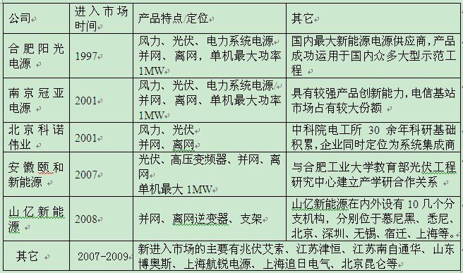 合肥阳光电源是国内最大新能源电源供应商,产品涵盖风力、光伏、电力系统电源,产品成功运用于国内众多大型示范工程,2008年市场占有率70%,2009年占有率约63%,当年光伏逆变器出货量约80MW,目前国内主要竞争对手为SMA、Satcon等国际厂商。合肥阳光电源为2010年福布斯中国企业潜力榜百强,预计近年在A股上市,进入发展的快车道。