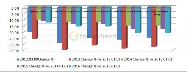 首先从补助金额下修来看,2012年3月9日的调整相较于2012年1月1日而言,下修幅度在20%至30%,其中屋顶系统调整幅度最大集中在10kW至10MW等中大型光伏系统上,而地面型光伏系统小于10MW的部分调整幅度约25%;除此之外,自2012年5月1日起补助金额将按月固定下调0.15欧元/kWh