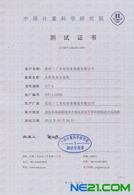 2011年11月,三工光电完成了对太阳能电池片分选机的升级,经中国计量科学研究院实地检测,符合AAA级标准,部分指标达到A+标准,2012年2月,我公司收到了中国计量科学研究院的AAA级证书。