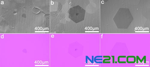金属所科研人员在前期常压CVD方法生长石墨烯的基础上,提出采用贵金属铂作为生长基体,实现了毫米级尺寸六边形单晶石墨烯的制备(图1),并制备出由毫米级单晶石墨烯构成的石墨烯薄膜。研究发现,多晶铂和单晶铂上石墨烯的生长行为相似,铂对甲烷和氢气较强的催化裂解能力以及反应中低浓度甲烷和高浓度氢气的使用是实现石墨烯低成核密度并最终制备出大尺寸单晶石墨烯的关键。由于石墨烯与铂基体热膨胀系数差别小,所得石墨烯上褶皱的平均高度仅为0.8纳米,远小于铜、镍基体上生长的石墨烯的褶皱。他们与中科院大连化学物理研究所包信和研究团队合作,利用选区低能电子衍射和低能电子显微镜对单个石墨烯岛进行了表征,发现具有规则六边形结构的石墨烯岛均为单晶,而边界处有凹角存在的石墨烯岛多为多晶结构。