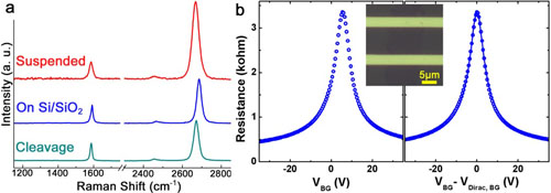 与此同时,他们还发明了一种基于电化学气体插层的鼓泡无损转移方法,可将铂上生长的石墨烯转移到任意基体上(图2)。与现有基于基体腐蚀的传统转移方法不同,该转移方法对石墨烯及铂基体均无破坏和损耗,铂基体可无限次重复使用。转移后的石墨烯完整保留了其原有的结构和质量,无金属杂质残留(图3)。该鼓泡转移方法操作简便、速度快、无污染,并且适于钌、铱等贵金属以及铜、镍等常用金属上生长的石墨烯的转移,金属基体可重复使用,可作为一种低成本、快速转移高质量石墨烯的普适方法。拉曼光谱研究表明,该方法转移的单晶石墨烯具有很高的质量(图4)。他们进而与北京大学电子系的彭练矛研究团队合作,将转移到Si/SiO2基体上的单晶石墨烯制成场效应晶体管,测量出该单晶石墨烯室温下的载流子迁移率可达7100cm2V-1s-1(图4),并有望通过使用氮化硼基体得到进一步提高。