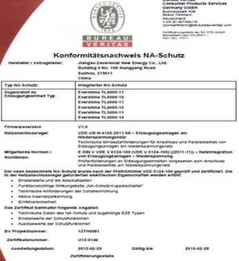 索比光伏网讯:2012年2月,江苏兆伏爱索新能源股份有限公司(以下简称兆伏爱索),继三相机TLC10K、TLC12K、TLC15K及TLC17K在国内首个获得VDEAR-4105证书后(2012年1月23日取得证书),Evershine系列光伏" title="光伏新闻专题">光伏逆变器TL3000,TL4000,TL5000又获得了VDEAR-4105并网部分证书,再次成为国内第一家获得单相机4105证书的逆变器生产厂家。