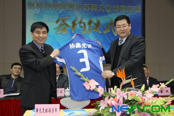 发布会上,田野副总裁与江苏舜天足球俱乐部董事长龚建人签约,根据协议内容,保利协鑫将向江苏舜天足球俱乐部提供2012整个赛季的赞助。田野表示,江苏舜天足球的体育精神感染着每一位协鑫人,激励着每一位江苏人。和舜天足球俱乐部一样,保利协鑫秉承“把绿色能源带进生活”的理念,不断追求更快、更高、更强的发展境界。保利协鑫将与舜天足球一同不懈努力,为创享积极、健康、和谐的现代绿色生活,为江苏的美好未来而并肩拼搏奋斗。最后,田野寄语舜天足球佳绩连连、事业蓬勃兴旺。