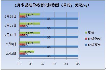 索比光伏网讯:多晶硅价格在今年初有回暖态势,,但回暖幅度较为缓慢。二月以来多晶硅价格还在缓慢的回升。多晶硅价格价格高点在2月初为35美元/kg,价格低点为30.5美元/kg,平均价格为31.25美元/kg,随后一周多晶硅均价上涨了1.6%,均价涨至31.75美元/kg,但高点价格和低点价格仍为35美元/kg和30.5美元/kg。随后两周多晶硅维持了连续两周的稳定,直至2月最后一周,虽然多晶硅价格高低和低点仍为35美元/kg和30.5美元/kg,但平均价格下跌了0.03%,至31.74美元/kg,但整体而言,多晶硅价格走势均价二月上涨。