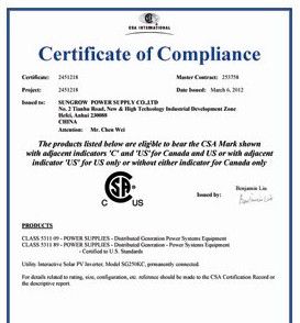 北美地区地域广阔、光照资源良好,近年来光伏应用市场快速发展,已成为全球光伏产业发展的一个最重要市场之一,但市场的准入要求较高。为进入该市场,阳光电源充分发挥其领先技术优势,专门开发了满足当地市场要求的系列产品。其中100千瓦系列的光伏逆变器之前已凭借优异的性能通过了ETL认证,获准进入北美市场。此次,SG250KC再次凭借良好的设计和优异的技术性能指标,顺利通过CSA的各项检测及相关标准的指令和要求,并取得了CSA认证,进一步丰富了阳光电源在北美市场的产品阵线,为其北美市场的开拓提供了新的支撑。