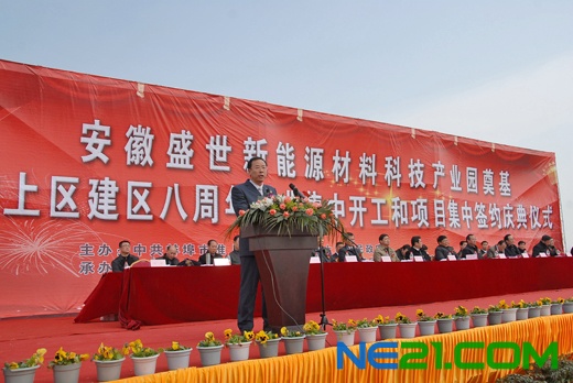 茆令文在致辞中指出,安徽盛世新能源材料科技产业园项目的开工建设,是蚌埠玻璃工业设计研究院按照市委市政府要求,牢记“蚌埠”、“玻璃”两个关键词,以技术创新为驱动,积极投身合芜蚌自主创新试验区建设,推进蚌埠工业强市战略,利用具有自主知识产权的最新成果,继在蚌埠建设中国玻璃新材料科技产业园和凯盛科技园之后,建设的又一个高科技园区,也是在蚌埠发展新玻璃、新材料和电子信息产业的又一重要举措。项目符合国家产业结构调整要求,符合中国建材集团“三新”产业战略布局,符合蚌埠市、淮上区争先进位和加速崛起需要,项目将打造成为国内一流的新能源新材料产业基地。