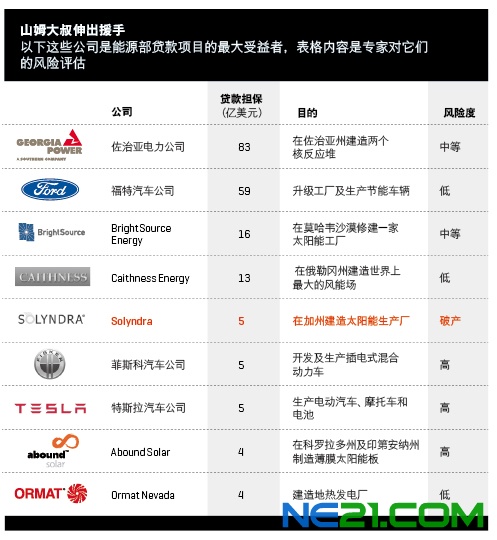 能源部选择的其他一些企业远远没有这么高的风险。最大的两笔贷款担保批给了佐治亚电力公司(Georgia Power,给了83.3亿美元,建造两座核反应堆)和福特汽车公司(Ford,给了59亿美元,升级工厂并生产电动车辆)。到目前为止,能源部贷款的主要是太阳能、风能和地热项目,它们最有可能形成稳定的收入流,因为它们都与大型公共事业公司签订了销售电力的长期合同。Caithness Energy公司用能源部13亿美元的贷款担保在俄勒冈州建造世界上最大的风能电场,并与南加州爱迪生公司(Southern California Edison)签订了合约。风险稍高的当属BrightSource Energy公司,它正在莫哈韦沙漠修建巨大的太阳能集热场,但它必须达到公用工程合约中许诺的速度和规模。不过,即便是这其中的几家企业出了问题,它们可观的资产也能减少政府的损失。“最后证明,大多数项目都很安全。”位于纽约的瑞穗证券美国公司(Mizuho Securities USA)清洁能源分析师保罗·克莱格(Paul Clegg)说。“风险低得就像买进一家公共事业公司的债券。”