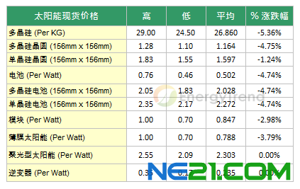 调查显示,目前厂商已针对三月下旬或四月的报价展开协商,而在价格调整的幅预估将有一成左右。在本周现货报价部分,受到贸易商与部分厂商积极出清多余料源的影响,目前多晶硅价格持续下滑,本周最低价格来到$24.5/kg,平均价位来到$26.86/kg,跌幅为5.36%;在硅晶圆部分,与上周相较价格出现明显修正,本次多晶硅晶圆平均价格下滑至$1.164/piece,跌幅为4.75%;而单晶硅晶圆平均价格下滑至$1.597/piece,跌幅为1.24%。电池与模块方面,部分厂商积极出价抢单的效果显见,使得电池与模块价格出现修正;本周电池平均价格为$0.502/Watt,跌幅4.74%,其中单晶与高效产品价格出现明显修正,而未来上述产品修正的幅度,将影响电池产品后续的走势。而在模块方面,由于中国政府透露出整顿产业的讯息,加上需求转弱与杀价抢单影响,使得本周平均价格下滑到$0.847/Watt,跌幅为2.98%;受到硅晶模块价格的压力,薄膜产品的报价也出现下滑,本周平均价格来到$0.788/Watt,跌幅为3.79%。