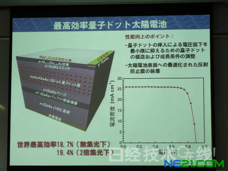 此次开发的太阳能电池单元的开路电压为0.9V,填充因子(FF)为0.8。据荒川介绍,今后“将把量子点的母材换成带隙大于GaAs的GaN和InGaAsP,同时还将优化量子点的层叠数和母材质量,希望能使单元转换效率提高至30~40%”。