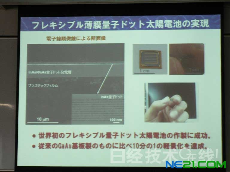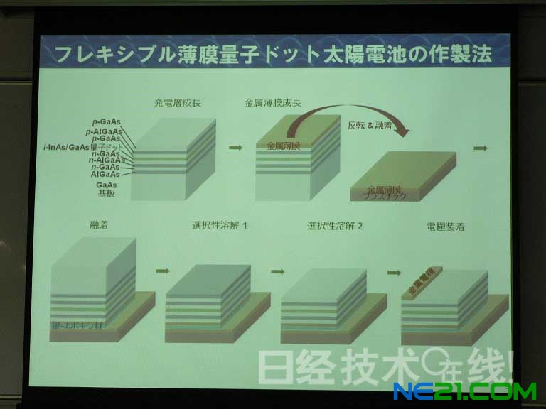 除了上述成果外,东京大学和夏普还成功地在柔性基板上制作出了量子点型太阳能电池,这在业界也是首创。具体方法是在GaAs基板上采用MBE(分子束外延法)形成十层的InAs/GaAs量子点层,然后将其上下翻转贴在树脂(聚酰亚胺)基板上。粘合材料采用基于银(Ag)纳米粒子的导电性环氧树脂材料,即使在200℃以下的低温条件下也能牢固地粘合。