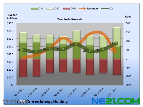 在年度表里,英利的趋势看起来非常好。现金循环周期从2007年的180天逐渐下降至2011年53天。2011年现金循环周期53.1天相比于五年平均值134.4天要少了81.3天。这表明英利企业效益持续上升,资金使用效率不断提高。促使现金循环周期降低的两个重要因素为DIO(库存周转天数)与 DPO(付款天数)。从图中可见,DIO大致呈下降趋势,而09年至11年付款天数要比前面三年多很多天。