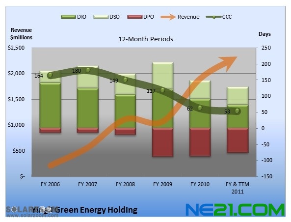 来源:solarzoom发布时间:2012-03-15 23:59:59 索比光伏网讯: 很多投资者都懂“以钱生钱”这个道理。当传统商业媒体将目光凝聚在“多少”上时,似乎很少有人问一句有“多快”。 判断一个企业的前景,企业在经营中从付出现金到收到现金所需的平均时间(即现金循环周期(cash co