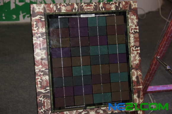 目前普通得太阳能电池片都是蓝色得,随着光伏发电项目应用范围的不断拓展,不仅要求太阳能电池转换效率不断提高,而且对产品外观有了更多得要求。此次展会上江苏瑞新科技股份有限公司展出彩色太阳能电池组件产品。