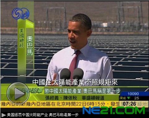 奥巴马(美国总统):事实上,昨天我的政府认定,中国在太阳能产业不照规矩来,所以我采取公平竞争的第一步。因为当大家都遵守一样的规则,我深信不疑美国工人和美国产业一定会赢。所以我们将确保我们的律法被确实实施。