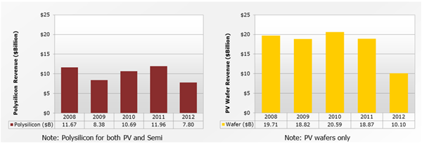 索比光伏网讯:2011年多晶硅和硅片价格下滑幅度近50%。鉴于2012年太阳能需求将下降或与2011年持平,多晶硅和硅片价格将继续承压。受此影响,多晶硅和硅片行业营收预计将出现萎缩,多晶硅行业下滑35%,硅片行业下滑47%。