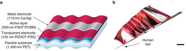 ![]() (a)超轻柔性有机太阳能电池,(b)包裹着半径35微米的人类头发。 来源:东京大学 |