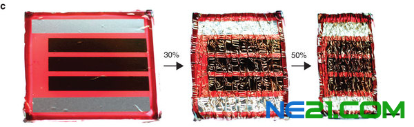 ![]() (c)可伸缩的太阳能电池在制备时,要使超薄太阳能电池附着到预先拉伸的弹性塑料上。 来源:东京大学 |