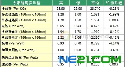 本周现货报价部分,市场需求持续低迷,然多晶硅厂仍积极要求客户履行合约,使得晶圆与电池厂商持续出清多余的料源,然考虑进货成本,卖价仍未出现太大的变动,本周多晶硅最低价仍维持在$22/kg,但平均价位微幅下滑至$23.74/kg,跌幅为0.25%。在硅晶圆部分,多晶硅晶圆市场买气明显减弱,然中国主要厂商仍维持高产能利用率,使得中国市场本周出现明显的跌幅,本周平均价格下跌到$1.081/piece,跌幅为1.99%;而在单晶硅晶圆方面,本周平均价格持平。电池方面,由于厂商并未杀价接单,因此本周价格仅小幅调整,本周平均价格为$0.475/Watt,跌幅0.42%;在模块方面,受到中国市场的报价出现明显下滑,使得本周平均价格出现明显的变动,与上周相比,本周价格跌破$0.8/Watt,来到$0.788/Watt,跌幅为4.14%;而受到模块价格持续下跌的影响,薄膜价栍也连带受到影响,本周价格出现明显调整,平均价格来到$0.761/Watt,跌幅为3.43%。
