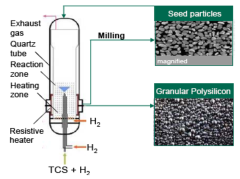 和REC采用的硅烷流化床法类似的是由美国MEMC最早推出的流化床法,以STC、H2、冶金硅和HCl为原料在流化床(FBR)高温(500℃以上,不算很高)高压(20bar以上)下氢化生成TCS,TCS通过一系列歧化反应后制得硅烷气,硅烷气再通入有小颗粒硅粉的流化床反应炉内连续热解为粒状多晶硅。这种方法制得的多晶硅纯度相对较低,但基本能满足太阳能级多晶硅的要求。