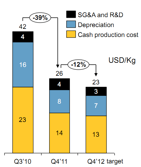 最近公布的2011年第四季度财报显示,截至2011年底,保利协鑫的多晶硅生产成本已经降至18.6美元/公斤(包括设备折旧成本,大约占14%),综合电耗可低至65度/公斤。