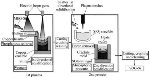 有别于改良西门子法和硅烷法的化学方法,冶金法是利用物理方法生产太阳能级多晶硅,其典型工艺是将纯度好的冶金硅进行水平区熔单向凝固成硅锭,去除硅锭的外表部分和金属杂质聚集的部分后,将硅锭粗粉碎并清洗,并在等离子体熔解炉中去除硼杂质,然后二次区熔单向凝固成硅锭,再次除去外表部分和金属杂质聚集的部分然后粗粉碎和清洗,最后在电子束熔解炉中除去磷和碳杂质直接生成太阳能级多晶硅。