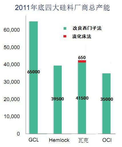 其实,从产业应用的角度来看也是如此。目前的四大多晶硅供应商(保利协鑫、德国Wacker、美国Hemlock、韩国OCI),除Wacker在Poly5生产线有650吨的流化床法产能之外,其余产能(截至2011年末约为18.1万吨)全部采用改良西门子法。