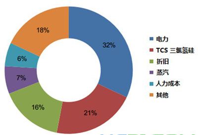 如上图所示,电力成本、TCS(三氯氢硅)成本和折旧是多晶硅生产中最大的三项独立成本,分别占到总成本的32%、21%、16%;排在其后的是蒸汽成本和人力成本,占比降低到7%和6%;其他成本主要包括气体成本(如氢气、氯气)、用水成本、设备维护和保养成本等,占比达到18%。