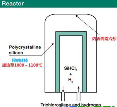 如上图所示,高纯TCS气体被氢气还原成高纯多晶硅的反应是发生在电加热至1000~1100℃的预制硅棒表面(气相沉积),为防止还原炉内表面发生气相沉积,也为维持炉体的机械强度,整个炉体的内表面需要用冷却液进行冷却。而电加热高温硅棒与炉体内表面之间的巨大温差使得大量的热能通过冷却表面损失掉,还原过程中需要对硅棒进行持续加热,这正是还原电耗很高的主要原因。