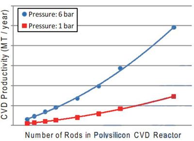如下图所示,单台还原炉的产能随着硅棒数量的增加而增加;相同条件下,常压还原炉(1bar,1个大气压)的产能只有加压还原炉(6bar)的三分之一。