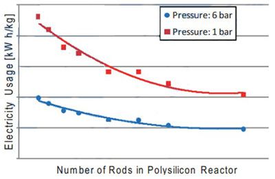 CVD还原炉生产是一个非连续过程,要降低多晶硅的单位电耗就要提高还原炉的单炉产能和缩短单炉生产周期。现实情况中,提高单炉产能比缩短生产周期更为可行,目前的收效也更为明显。