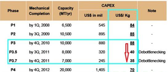 与之类似的情形是,多晶硅厂在原有产能基础上进行扩张时也会受益于过程装置的共享,从而使单位建设成本较前期有显著下降。典型案例是韩国OCI(036490.KQ)和保利协鑫。周旭辉1007先生撰写的深度研究报告《OCI与保利协鑫成本下降之路》显示,韩国OCIP3期多晶硅产能的初始规模是1万吨,对应的单位建设成本是88美元/公斤(2010年12月建成);之后在原有产能基础上进行扩建,首次新增的8000吨产能,单位建设成本陡降至40美元/公斤(2011年10月建成);再次扩建的7000吨产能,单位建设成本进一步降至35美元/公斤(原计划2011年12月建成,后延至今年Q2)。保利协鑫IR负责人汪满健先生在雪球i访谈中表示保利协鑫2011年新增产能的单位建设成本低于30美元/公斤。当然,除新旧产能间装置共享产生的“协同效益”之外,单位建设成本的大幅下降也得益于近期设备价格的明显降低。