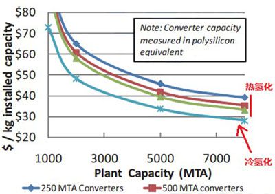 最后,选择合适的工艺方案和恰当的生产设备也可以降低单位建设成本。GTAT提供的资料显示,一个年产6000吨的多晶硅项目,配备20台300吨(MTA)还原炉将比配备30台200吨(MTA)还原炉节省数千万美元的资本支出(CAPEX),因为每台还原炉都需要配备气体供给、冷却水供给、尾气回收、冷却水回收、电源系统、控制系统,30台还原炉还需要更大的厂房面积(当然,后续运营时需要更多的操作人员,运营、维护成本也更高)。氢化工艺及装置(将STC氢化为TCS)的选择也是如此,保利协鑫2011年9月投入运行的单体冷氢化装置已经达到10万吨(MTA),而目前市场上最大的热氢化转化炉产能也不会超过500吨(MTA),这使得冷氢化装置的单位建设成本更低。下图是2009年GTAT测算的不同工艺方案和产能规模对氢化装置单位建设成本的影响,尽管有点过时(冷氢化工艺现在的优势应该更为明显),但仍具有指导意义。
