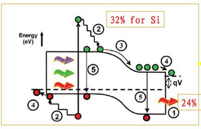 首选叠层太阳电池的理由,1.更宽光谱吸收2.更小的载流子热驰豫能量损失3.更高的光生电压4.更高的转换效率5.更好的稳定性
