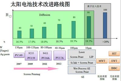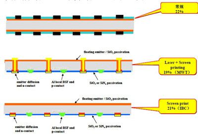 按常规工艺生产的电池效率,一旦提升到18%即进入瓶颈期。转换效率提升必定要引用新技术革新,例如:SE、MWT、HIT、EWT、IBBC等技术。