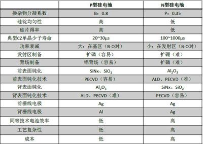 针对N、P两种不同掺杂类型的电池,围绕硅锭均匀性、少子寿命、发射区制备、背场制备、表面钝化、钝化技术及电池效率做了对比分析。