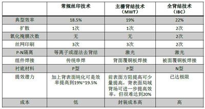 根据制程工艺、提效潜力和成本方面,按常规丝印技术、主栅背结技术和全背结技术分类比较。