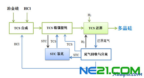 在TCS还原为多晶硅的过程中,会有大量的剧毒副产品四氯化硅(SiCl4,下文简称STC)生成。改良西门子法通过尾气回收系统将还原反应的尾气回收、分离后,把回收的STC送到氢化反应环节将其转化为TCS,并与尾气中分离出来的TCS一起送入精馏提纯系统循环利用,尾气中分离出来的氢气被送回还原炉,氯化氢被送回TCS合成装置,均实现了闭路循环利用。这是改良西门子法和传统西门子法最大的区别。
