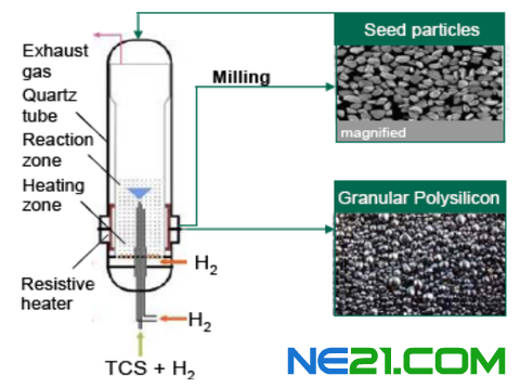 和REC采用的硅烷流化床法类似的是由美国MEMC最早推出的流化床法,以STC、H2、冶金硅和HCl为原料在流化床(FBR)高温(500℃以上,不算很高)高压(20bar以上)下氢化生成TCS,TCS通过一系列歧化反应后制得硅烷气,硅烷气再通入有小颗粒硅粉的流化床反应炉内连续热解为粒状多晶硅。这种方法制得的多晶硅纯度相对较低,但基本能满足太阳能级多晶硅的要求。