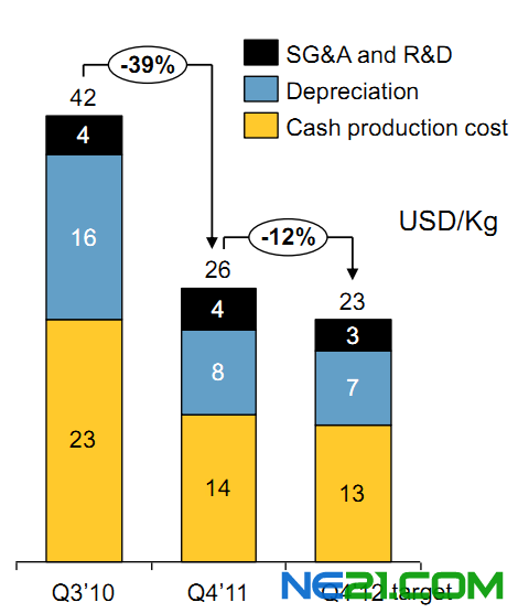 最近公布的2011年第四季度财报显示,截至2011年底,保利协鑫的多晶硅生产成本已经降至18.6美元/公斤(包括设备折旧成本,大约占14%),综合电耗可低至65度/公斤。