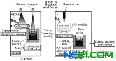 有别于改良西门子法和硅烷法的化学方法,冶金法是利用物理方法生产太阳能级多晶硅,其典型工艺是将纯度好的冶金硅进行水平区熔单向凝固成硅锭,去除硅锭的外表部分和金属杂质聚集的部分后,将硅锭粗粉碎并清洗,并在等离子体熔解炉中去除硼杂质,然后二次区熔单向凝固成硅锭,再次除去外表部分和金属杂质聚集的部分然后粗粉碎和清洗,最后在电子束熔解炉中除去磷和碳杂质直接生成太阳能级多晶硅。