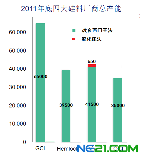 其实,从产业应用的角度来看也是如此。目前的四大多晶硅供应商(保利协鑫、德国Wacker、美国Hemlock、韩国OCI),除Wacker在Poly 5生产线有650吨的流化床法产能之外,其余产能(截至2011年末约为18.1万吨)全部采用改良西门子法。