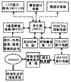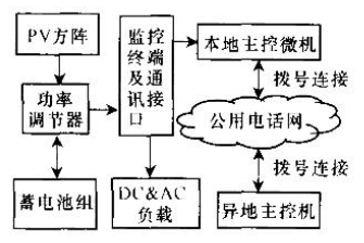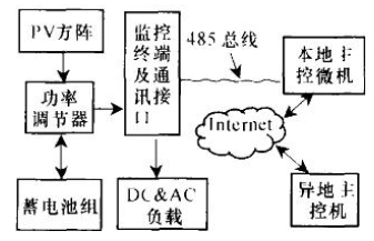 图5是一个基于485总线和Internet的光伏远程监控系统,它是一个基于网关服务器的设备网络接入方案,系统由监控终端、主控微机及监控系统软件、网关软件、通信接口组成。监控终端可以嵌入到光伏系统的功率调节系统中。通过WebChip的PS2000A芯片及底层网关服务器软件实现与本地主控机系统通讯。异地机系统通过Interner建立与本地机(IP地址)的联系,再由本地机上的网关服务器与监控终端系统建立通信链接。整个系统可通过主控机对负载运行实现远程开关控制。其原理见图6