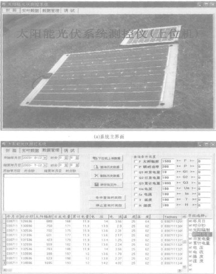 上位机系统软件是一个远程控制的客户端应用软件,其开发工具是Delphi60该软件能实现底层通信、实时数据显示、数据库管理和逻辑控制输出等功能。该软件通过底层通信模块,可每2s从下位机获得一次实测数据,如电压、电流、瞬时功率、温度等实时量,并能描绘出相应的实时曲线,每条实测数据都有对应的记录日志,方便查询分析;也可以设定每隔一定时间(如5min)从下位机获得实测数据存入数据库;数据库管理包括排序、查询、数据导出等。图7(a)是作者开发的上位机主监控系统界面,图7(b)显示通过主控机上传得到的监控终端测量、控制数据。监控终端的存储芯片可以保存半个月的测量数据,可根据需要定期上传,平时系统处于实时监控状态(每2s读一次,一次一条计录,16B)。记录字段包括年月日、时分秒、太阳能辐射量、日累计发电量、总累计产电量、充电电压、充电电流、环境温度、控制状态,如xxxx年xx月xx日、12时55分36秒、太阳能辐射880W/m2、日累计发电量168Wh、总累计产电量11.9kWh充电电压14V、充电电流3.56A、环境温度25℃、温度64%。通过数据处理,可以绘制曲线,对光伏系统效率、性能作统计分析、输出控制。