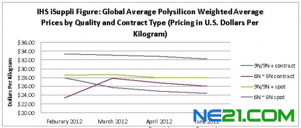 根据IHS iSuppli多晶硅价格指数(IPPI)预计,多晶硅价格在2012年底将降至每千克22美元。而随着供需形势的变化,到2013年底,多晶硅价格有望稳定在每千克23美元左右。
