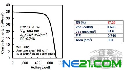 “从市面上的太阳能电池来看,转换效率最高的多晶硅刚刚逼近18%。但模块化之际,效率会降低1~2个百分点,实际效率估计在15~16%之间。而CIS太阳能电池包括死区在内,在具有所有模块要素的30cm见方的状态下,转换效率已经达到了17.2%。”