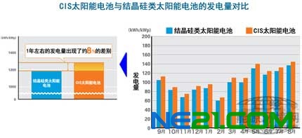 转换效率提高到顶级的CIS薄膜太阳能电池的实力在实际利用太阳光发电时得到充分发挥。已有验证结果表明“CIS太阳能电池几乎通年都比其他种类的太阳能电池发电量多”。最终CIS太阳能电池与结晶硅类太阳能电池相比,一年里也多发电约8%。