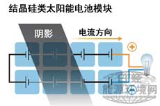结晶硅类太阳能电池是由几厘米到十几厘米见方的硅晶模块串联而成。如果其中之一被树影遮挡,或是因脏污而无法发电,串联电路就会断路,导致整块面板停止发电。