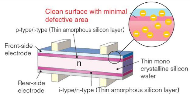 由于HIT太阳能电池使用a-Si构成pn结,所以能够在200℃以下的低温完成整个工序。和原来的热扩散型的结晶太阳电池的形成温度(~900℃)相比较,大幅度地降低了制造工艺的温度。由于这种对称构造和低温工艺的特征,减少了因热量或者膜形成时产生的Si晶片的变形和热损伤,对实现晶片的轻薄化和高效化来说是有利的,具有业界领先的高转换效率(研究室水平为23%,量产水平为20%),即使在高温下,转换效率也极少降低,利用双面单元来提高发电量。